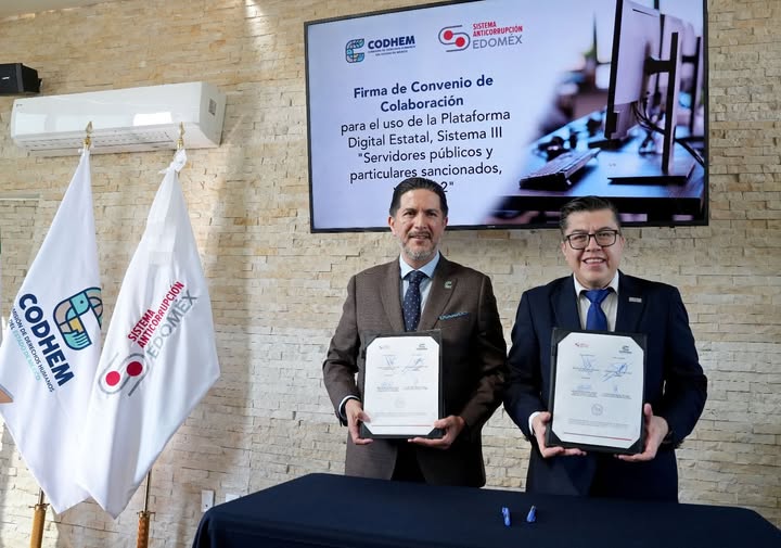 La Comisión de Derechos Humanos del Estado de México (CODHEM) y la Secretaría Ejecutiva del Sistema Anticorrupción del Estado de México (SESAEMM) firmaron un convenio de colaboración con el objetivo de impulsar acciones conjuntas orientadas a promover la integridad pública, la cultura de la legalidad y la prevención de conductas que afecten el ejercicio responsable del servicio público.