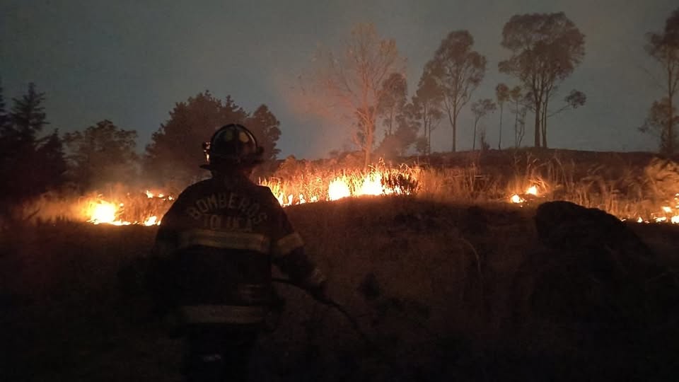 Elementos de Protección Civil y Bomberos de Toluca combaten un incendio de pastizal ubicado en el cerro de San Luis Obispo.