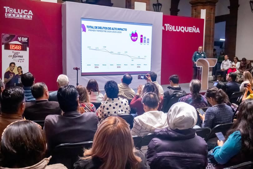 El Presidente Municipal, Ricardo Moreno presentó el balance sobre seguridad pública en Toluca, donde se muestra una reducción del 40.47% en los delitos de alto impacto en comparación con el mismo trimestre de los años 2024 y 2025, lo que refleja un avance significativo en la tranquilidad de las familias toluqueñas durante el primer trimestre de 2026.